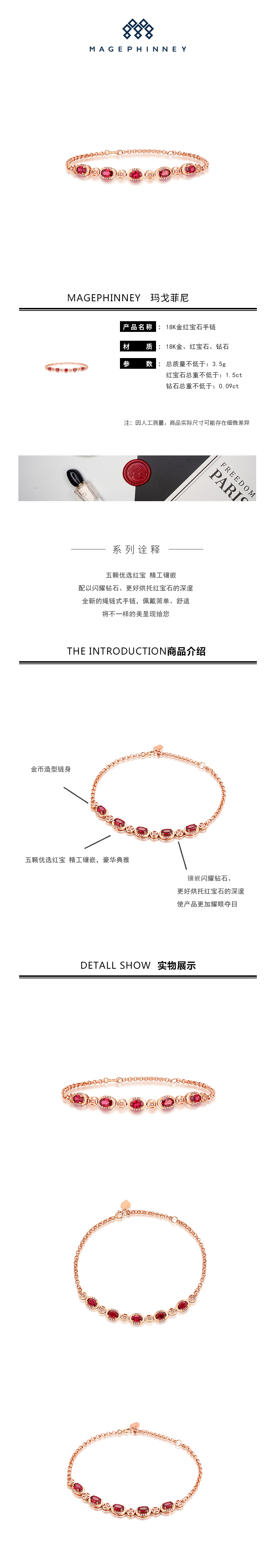 玛戈菲尼|水晶玛瑙手饰,-玛戈菲尼 "红粉佳人"系列奢华款18K金红宝石手链(5颗)